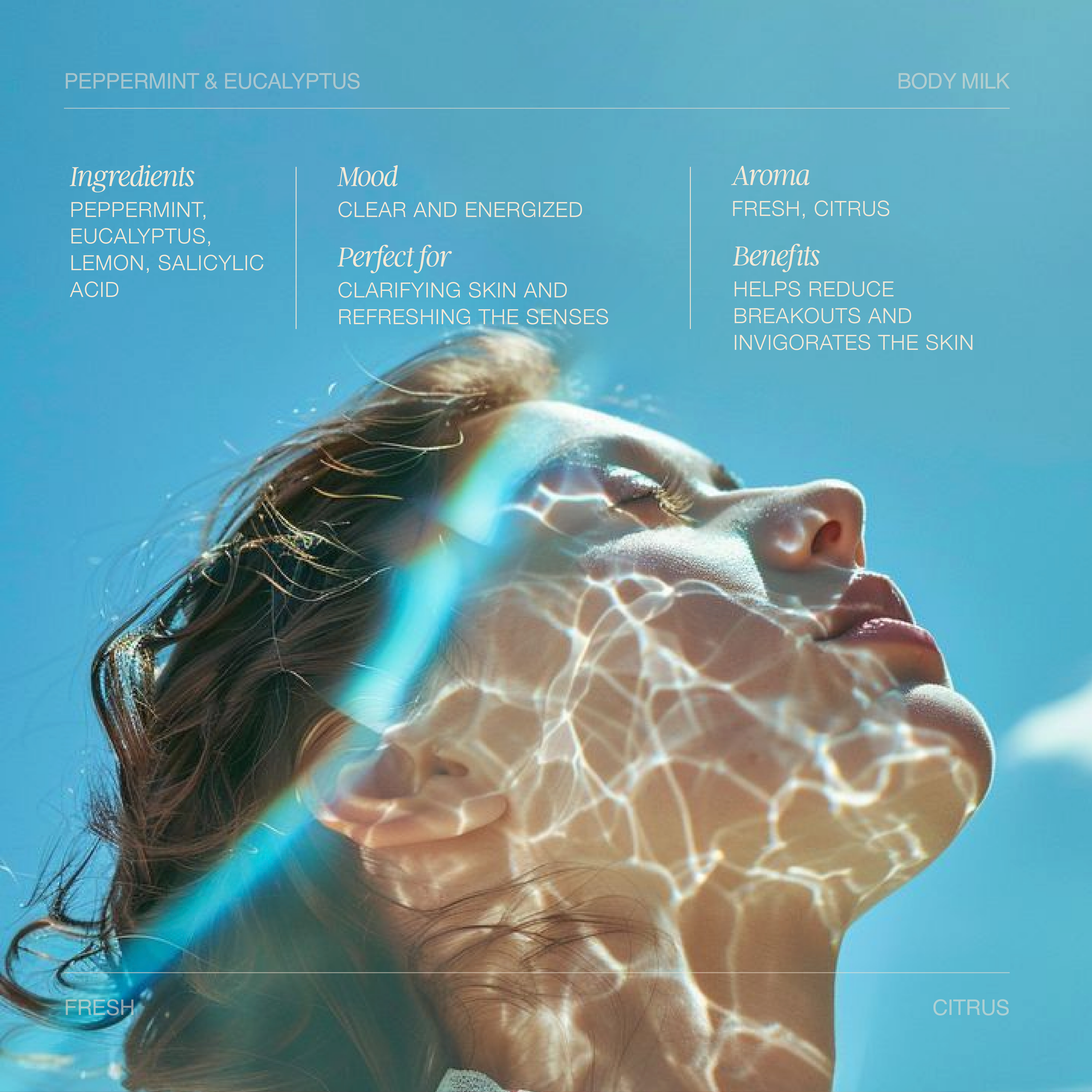 Cool and refreshing, this energizing body milk blends the crisp freshness of peppermint with the bright clarity of eucalyptus. Infused with salicylic acid, it gently exfoliates and clarifies acne-prone skin, leaving it smooth, soft, and revitalized. The refreshing, citrus-minty scent lifts the senses, offering an instant burst of energy.