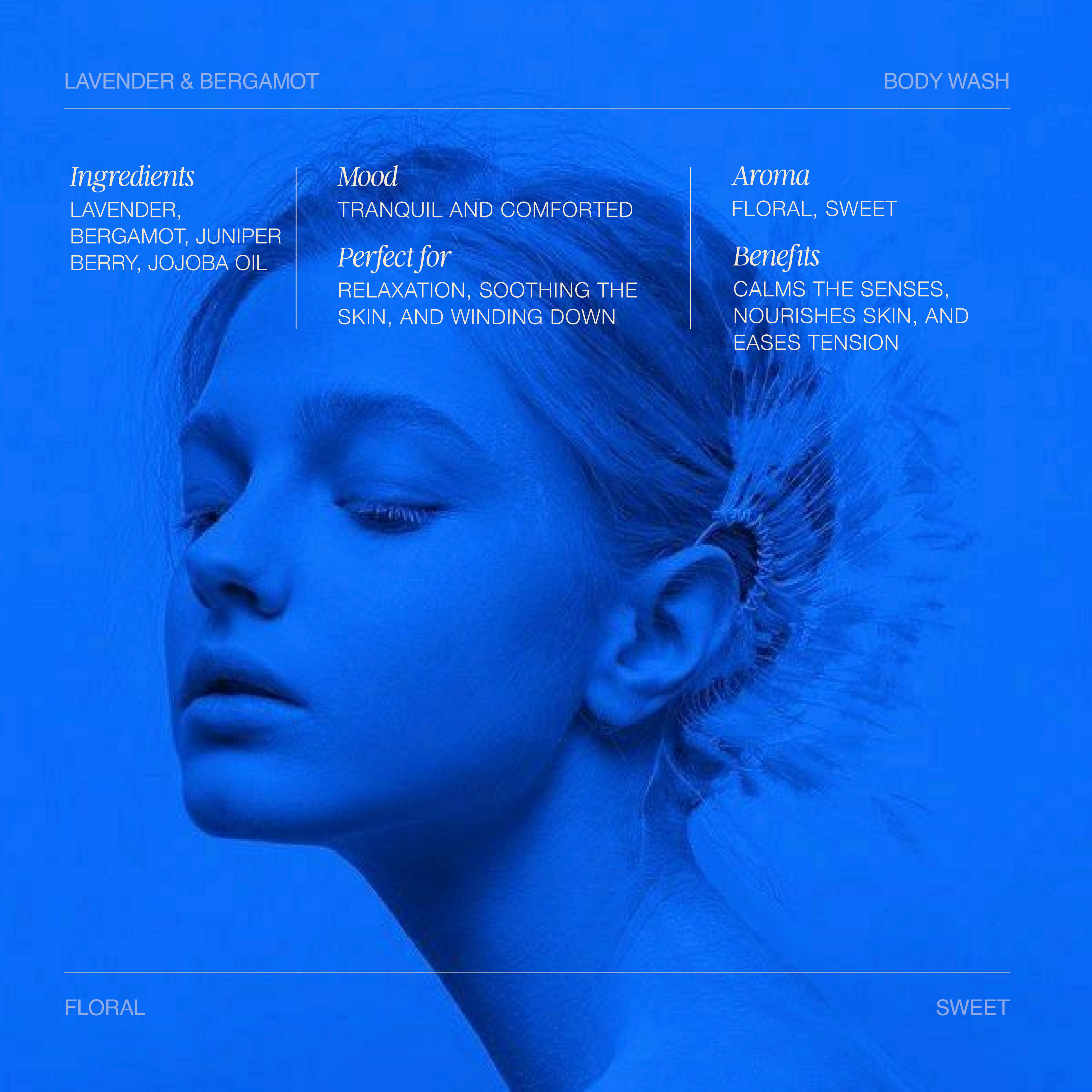 Pour a small amount into your palms or onto a loofah. Lather gently over damp skin, breathe in deeply, and let the calming notes of lavender and bergamot ground your senses. Rinse off and feel your skin refreshed, your mind at ease. Use daily as a ritual — a moment to elevate, indulge, and thrive.
